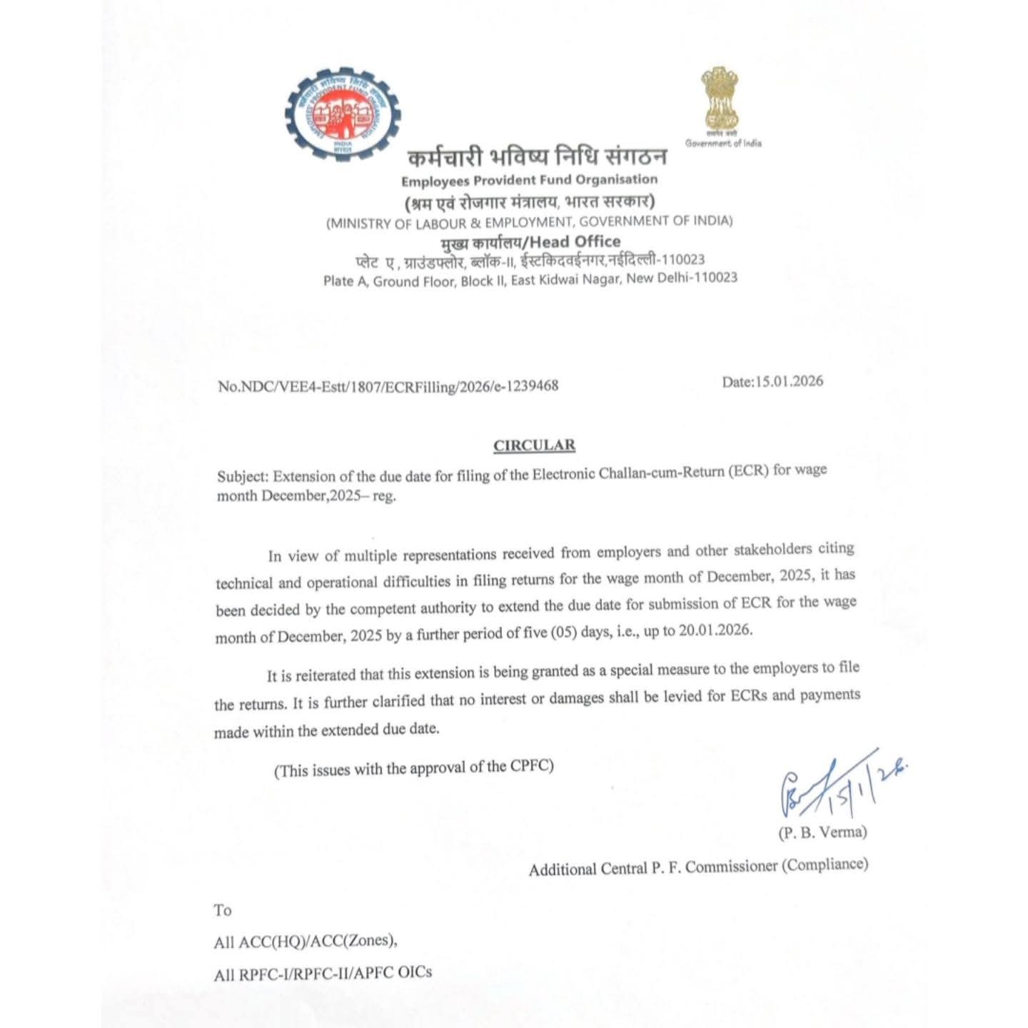 This is to inform you that the Employees’ Provident Fund Organisation (EPFO), Ministry of Labour and Employment, Government of India, has issued a circular dated 15 January 2026 regarding the extension of the due date for filing the Electronic Challan-cum-Return (ECR) for the wage month of December 2025.