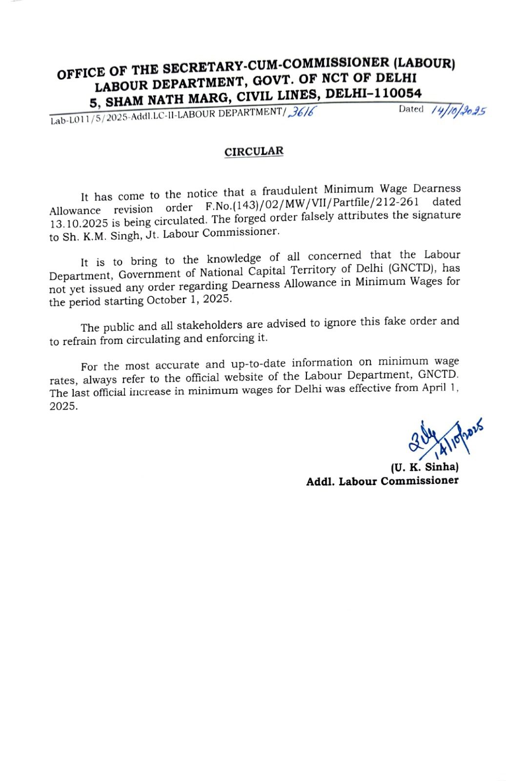 This is to inform you that the Labour Department, Government of NCT of Delhi, has issued a circular dated 14.10.2025 warning against a fraudulent Minimum Wage Dearness Allowance revision order (F.No.(143)/02/MW/VII/Partfile/212-261 dated 13.10.2025) currently in circulation.